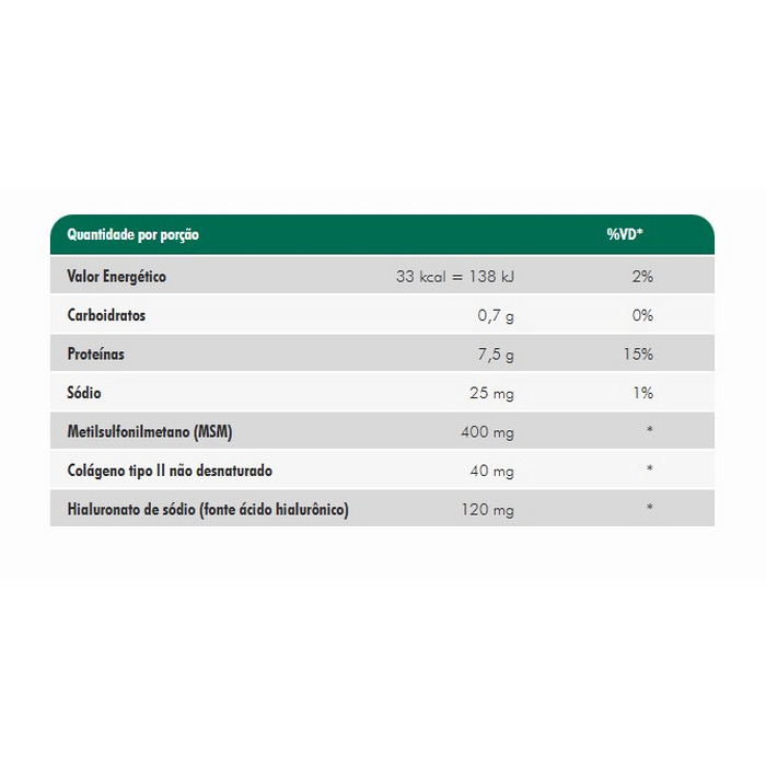Colágeno hidrolisado, metilsulfonilmetano (MSM), cúrcuma, hialuronato de sódio obtido pela fermentação de Streptococcus zooepidemicus, gengibre, colágeno de frango com colágeno tipo II não desnaturado, pimenta preta, acidulante ácido cítrico, aromatizante natural e edulcorante glicosídeos de esteviol (estévia). NÃO CONTÉM GLÚTEN.CONTÉM AROMATIZANTE. Não contém quantidades significativas de gorduras totais, gorduras saturadas, gorduras trans e fibra alimentar. (*) % Valores diários não estabelecidos.