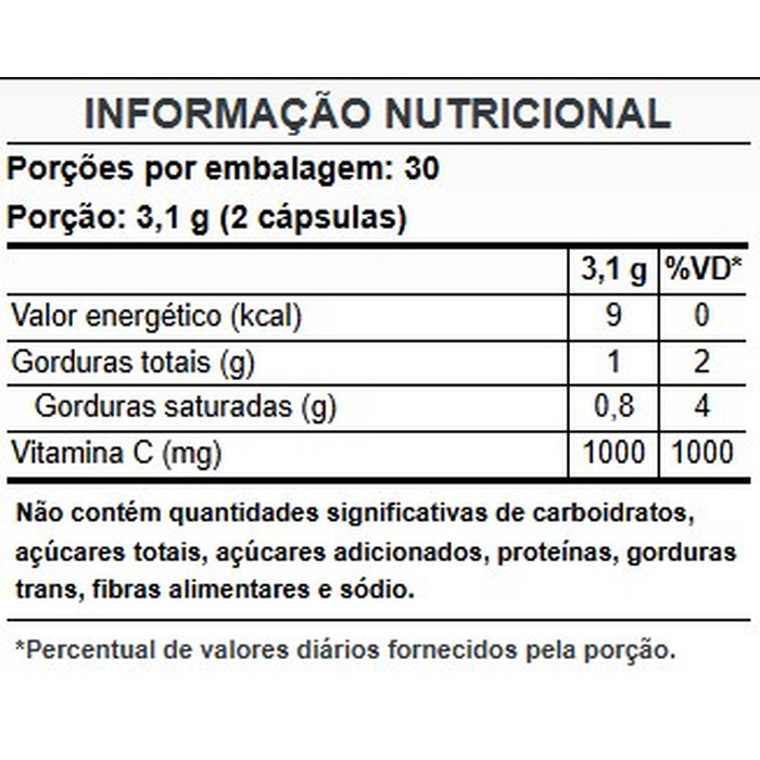 Ascorbato de cálcio, cápsula (gelatina, água purificada, umectante glicerina e corante natural clorofilina cúprica), óleo de coco, óleo de girassol e emulsificante lecitina de girassol.