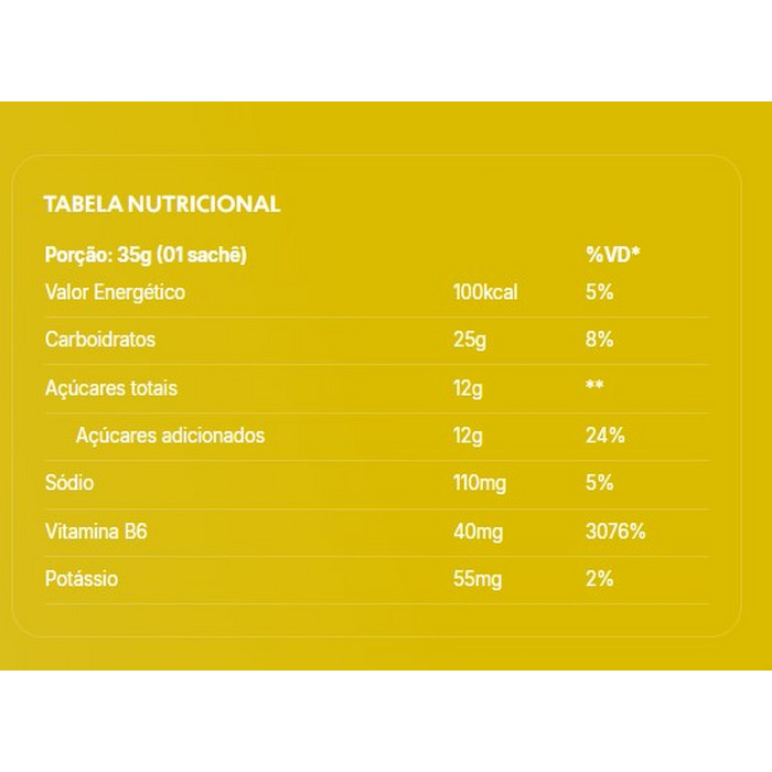 Maltodextrina, D-frutose, água purificada, cloreto de sódio, cloridrato de piridoxina (vitamina B6), acidulante ácido cítrico, aromatizantes, espessante alginato de sódio e conservantes e benzoato de sódio, sorbato de potássio.