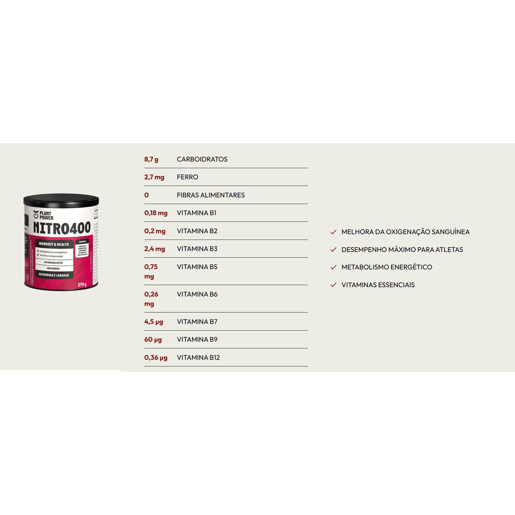 Ingredientes: beterraba em pó, laranja em pó, bisglicinato ferroso, tiamina mononitrato (vitamina B1), riboflavina (vitamina B2), cloridrato de piridoxina (vitamina B6), D-pantotenato de cálcio (Vitamina B5), nicotinamida (Vitamina B3), ácido fólico (Vitamina B9), D-biotina (vitamina B7), cianocobalamina (vitamina B12), acidulante ácido cítrico, antiumectante fosfato tricálcico, aroma natural e edulcorante glicosídeos de esteviol.