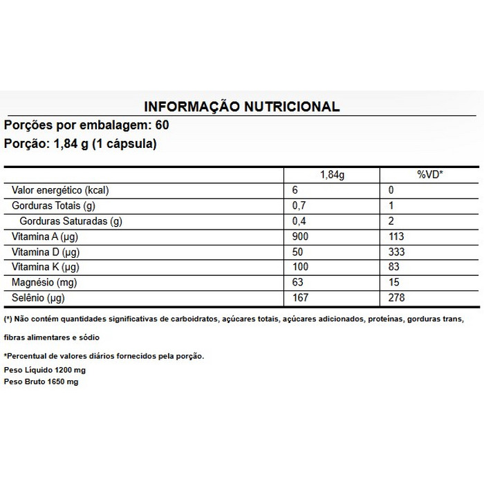 Cápsula (gelatina, água purificada, umectante glicerol e corante carbonato de cálcio), bisglicinato de magnésio, óleo de coco, óleo de girassol, selenito de sódio, menaquinona-7 (vitamina K2), palmitato de retinol (vitamina A), colecalciferol (vitamina D3), emulsificante lecitina e estabilizante cera de abelha.