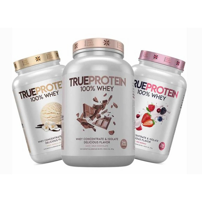 True Protein 100% Whey Blend (proteína concentrada do soro do leite e proteína isolada do soro do leite), beterraba em pó, aromatizantes, espessante goma xantana e edulcorantes glicosídeos de esteviol e taumatina. NÃO CONTÉM GLÚTEN.