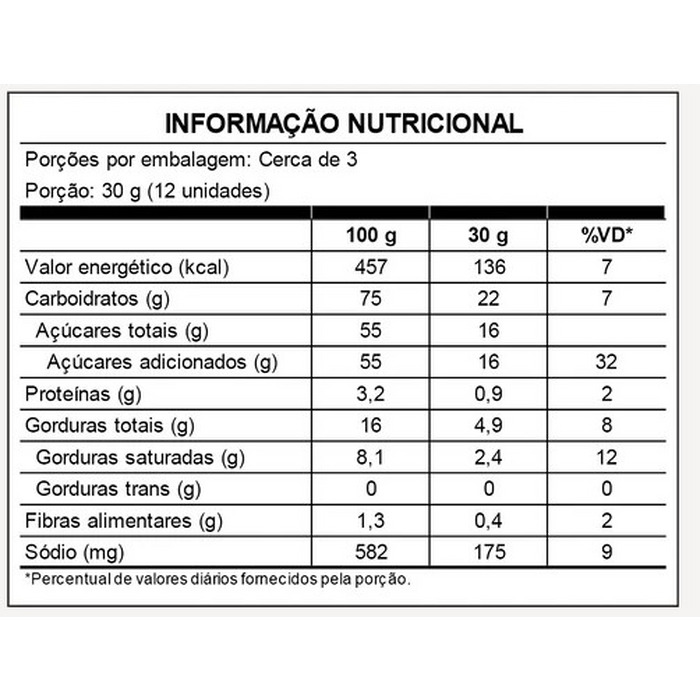Ingredientes: Farinha de mandioca tipo 1 Zaya, açúcar demerara orgânico, caramelo toffee (açúcar demerara orgânico, óleo de coco palmiste, farinha de mandioca tipo 1 Zaya e sal), óleo de coco palmiste, cacau em pó, açúcar de coco, flor de sal e emulsificante goma xantana. “