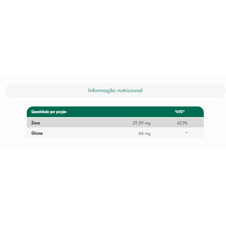 Bisglicinato de zinco, estabilizante celulose microcristalina e lubrificante estearato de magnésio. Cápsula verde: estabilizante hidroxipropilmetilcelulose, glaceantes carragena e acetato de potássio e corante clorofilina cúprica